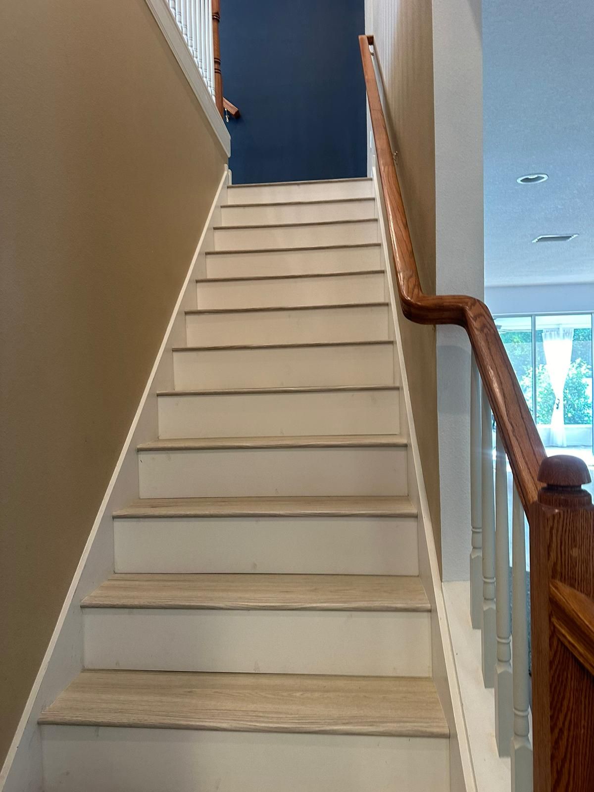 A close up of a wooden staircase with a black railing.