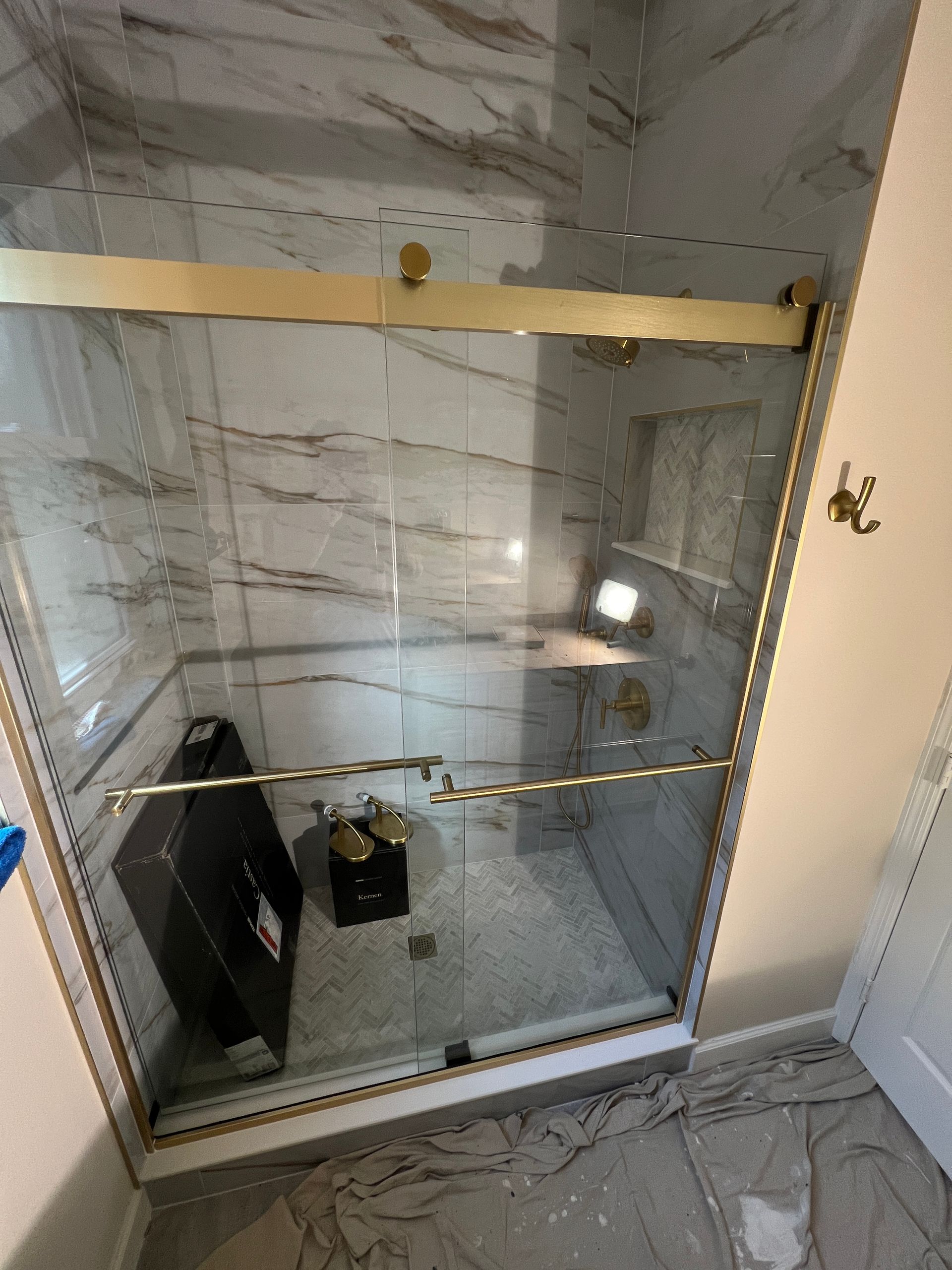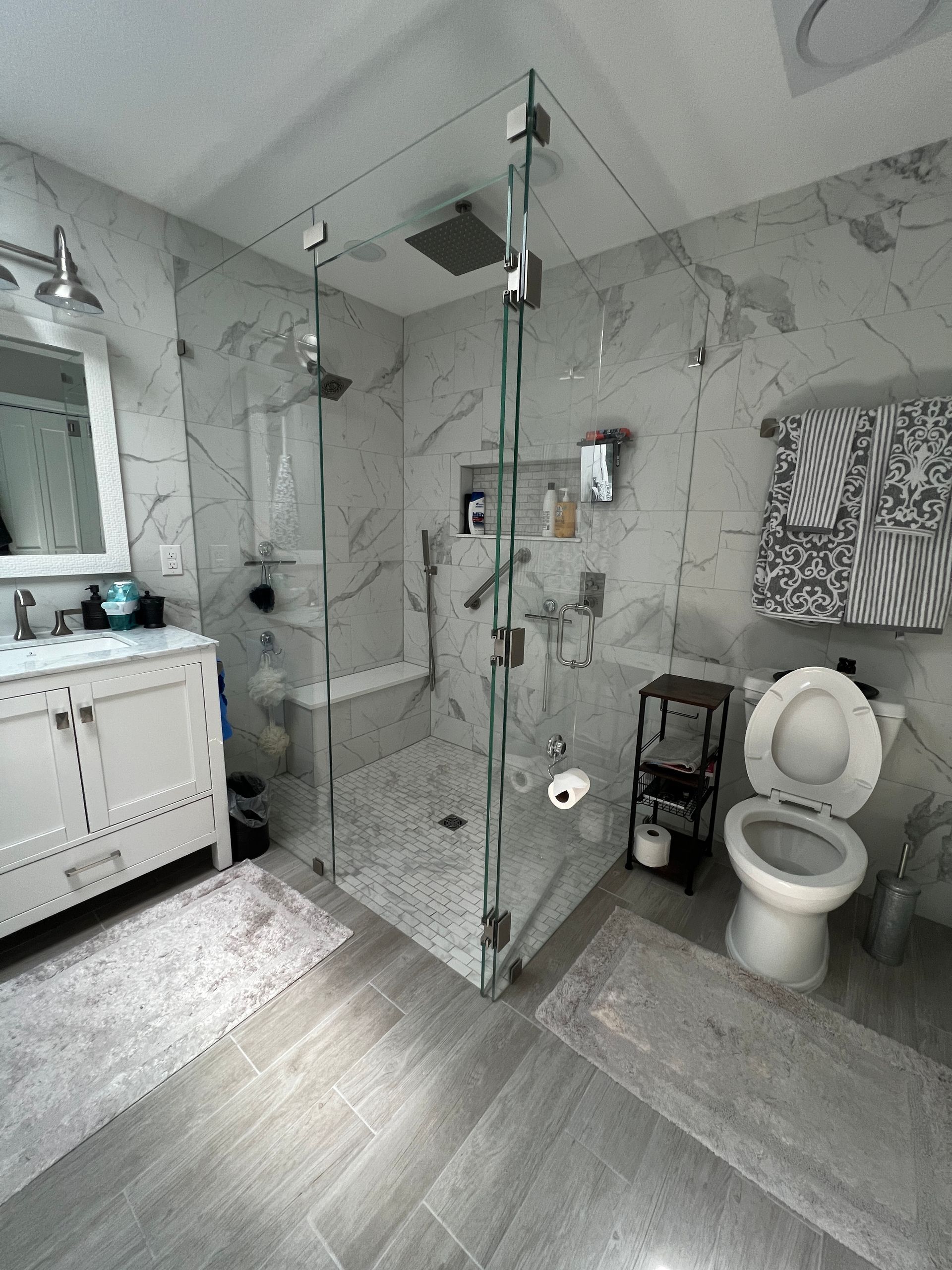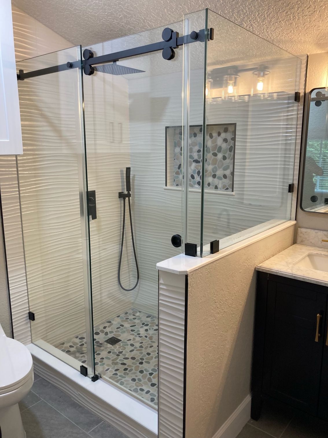 A bathroom with a walk in shower , sink , and window.