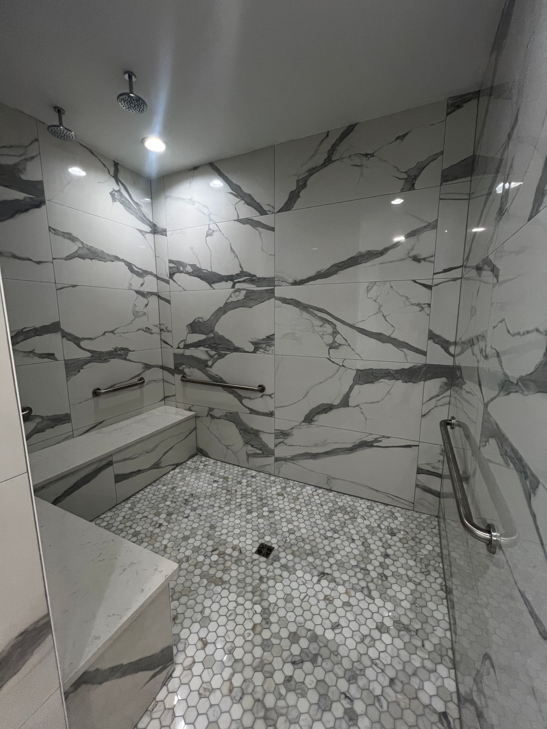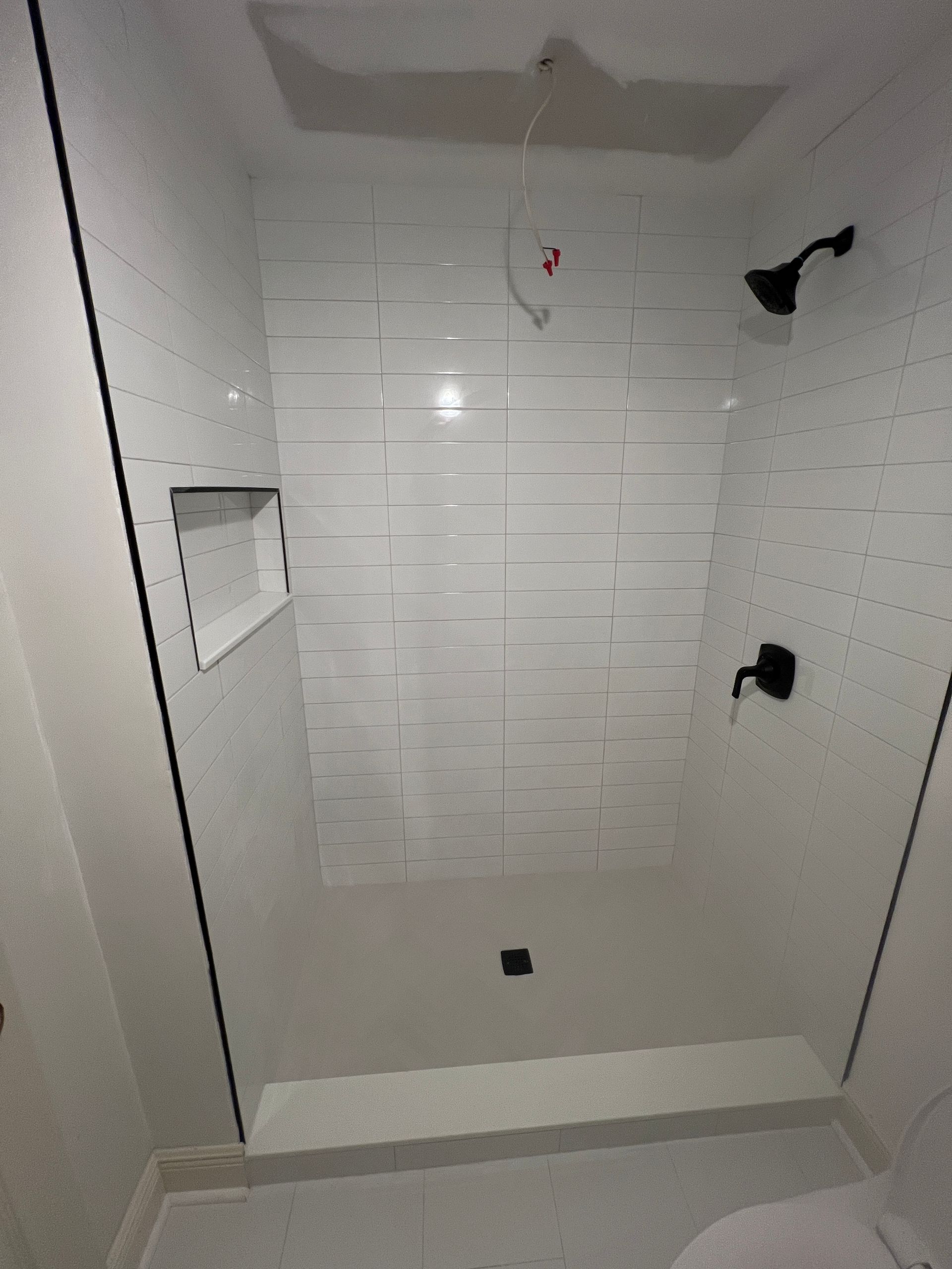 A bathroom with two shower heads and a black shower head.