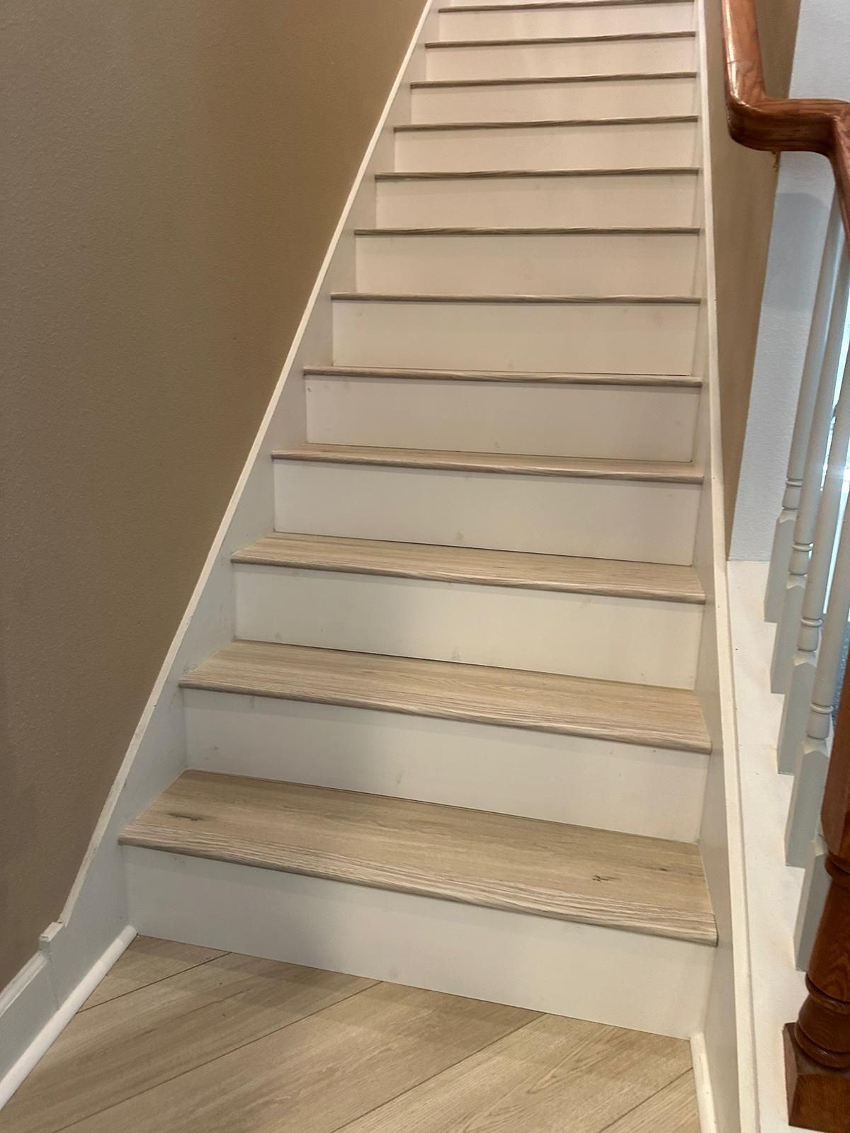 A wooden staircase with a metal railing is being installed in a house.